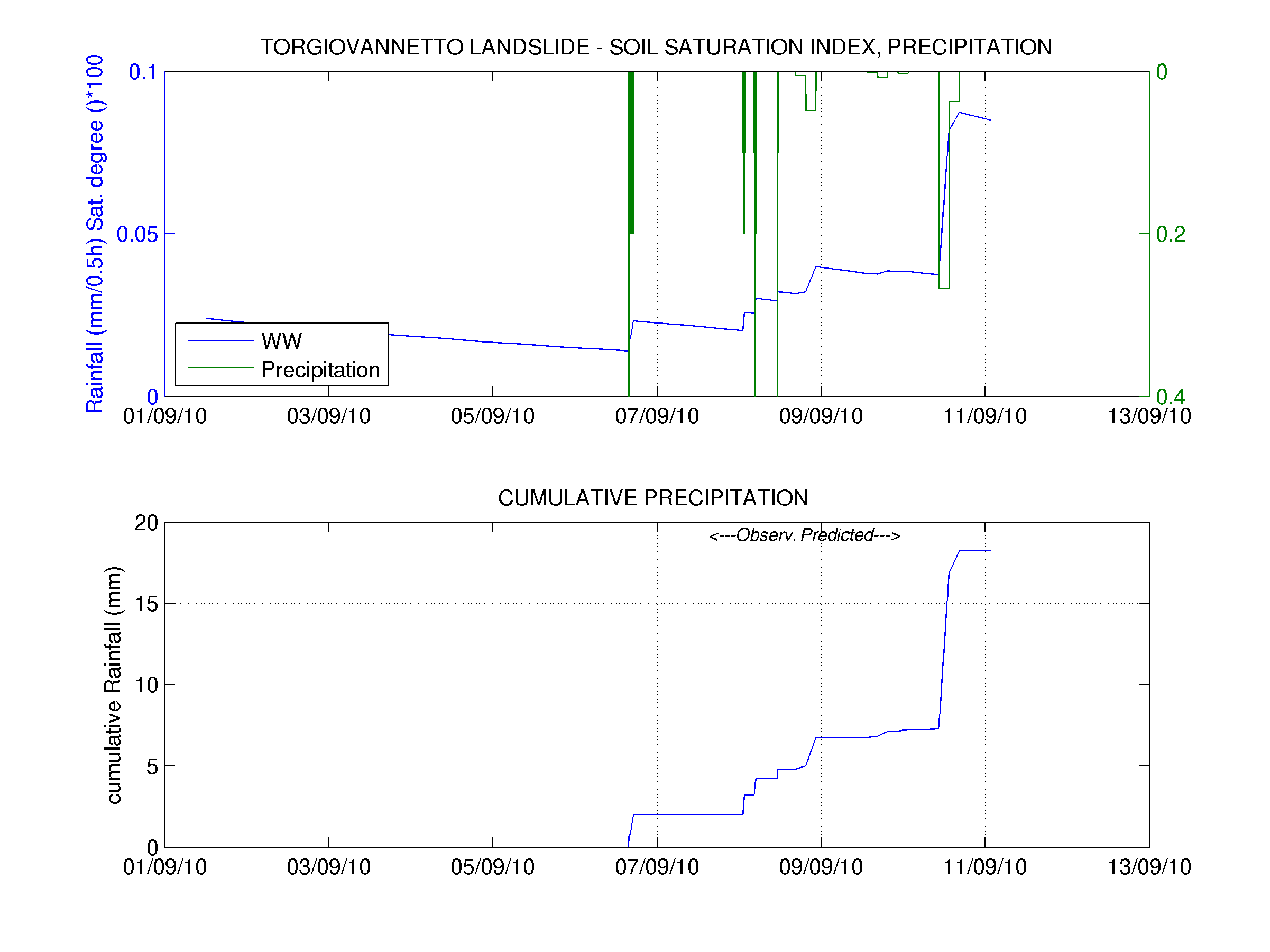 fig. 1 - sono riportati in alto gli istogrammi di pioggia osservata e prevista in sito insieme all’andamento della curva di saturazione in tutta la finestra temporale utilizzata, in basso l’andamento della curva di pioggia cumulata;