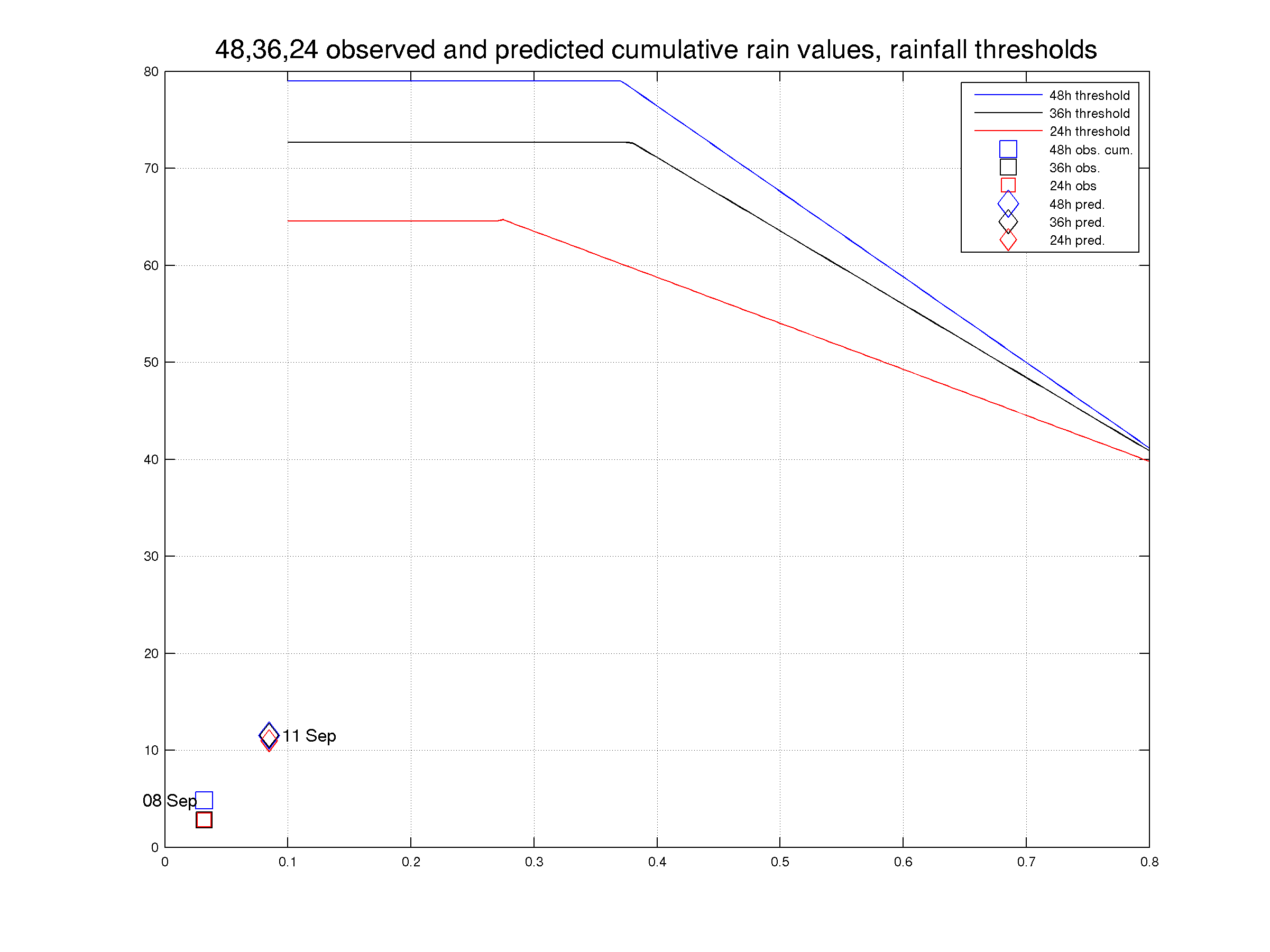I dati di pioggia cumulata sono attualmente calcolati per le tre maggiori durate delle 7 soglie pluviometriche di criticità ordinaria adottate dal CFD: 24h, 36h, 48h. I valori risultanti, osservati e previsti a 72ore, vengono confrontati con i corrispondenti valori delle soglie pluviometriche recentemente revisionati dal CFD e contenenti un fattore di correzione per l’indice di saturazione del suolo.