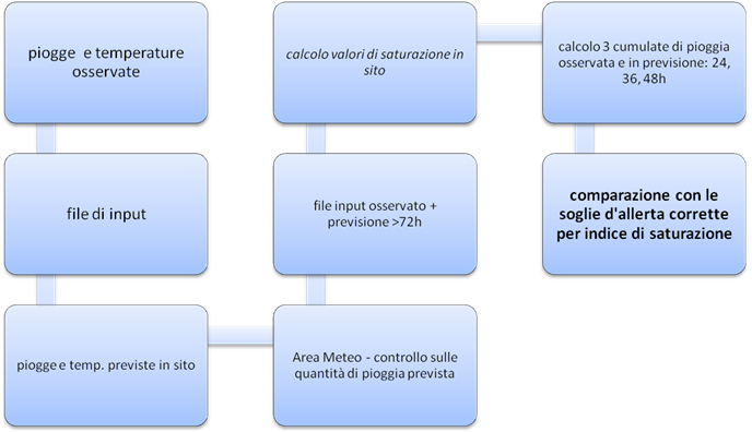 Viene così calcolata così la pioggia cumulata caduta e prevista in sito; viene inoltre valutato lo stato di saturazione del suolo tramite il modello di bilancio idrologico disponibile presso il CFD (descritto nella sezione MISD alla sezione (“previsioni idrologiche”) e adattato alle necessità del presente sistema.