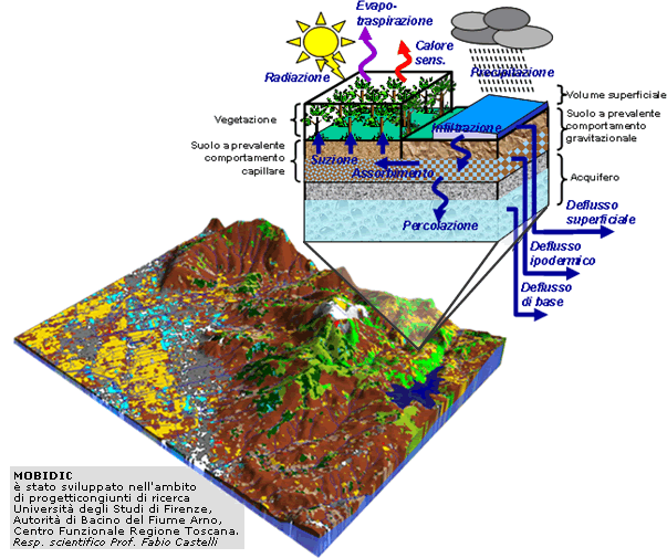 I moduli di calcolo di MOBIDIC forniscono la stima delle componenti idrologiche nel sistema suolo-vegetazione, nel sottosuolo e nei corpi idrici superficiali.